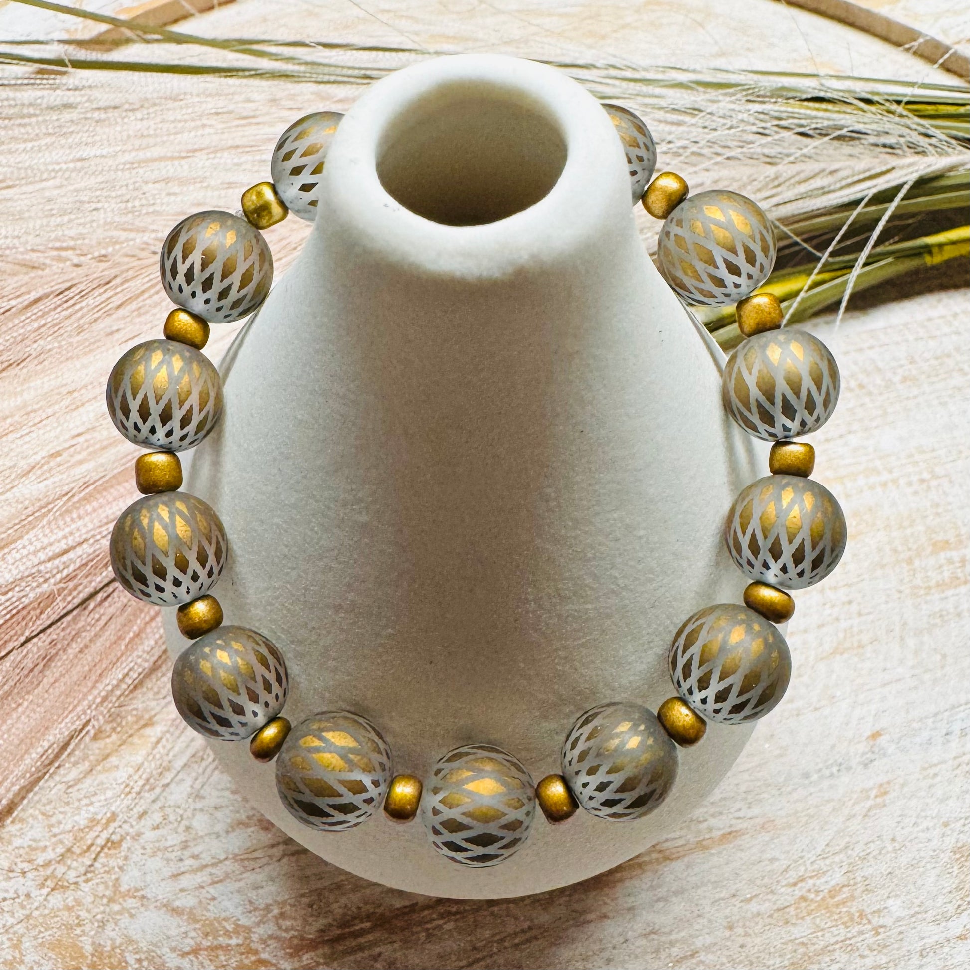 9.9 MM Ornate Glass Round Bead, 2.1 MM Gold Metallic Spacer, Clear Stretch Jewelry Fiber