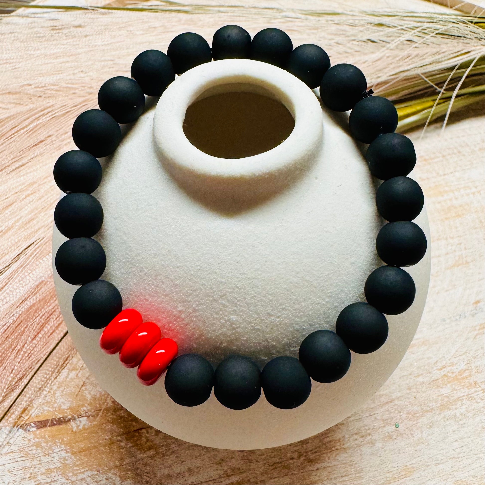 8 MM Black Glass Round Bead, 3 MM X 9 MM Red Disc Glass Bead, Clear Stretch Jewelry Fiber